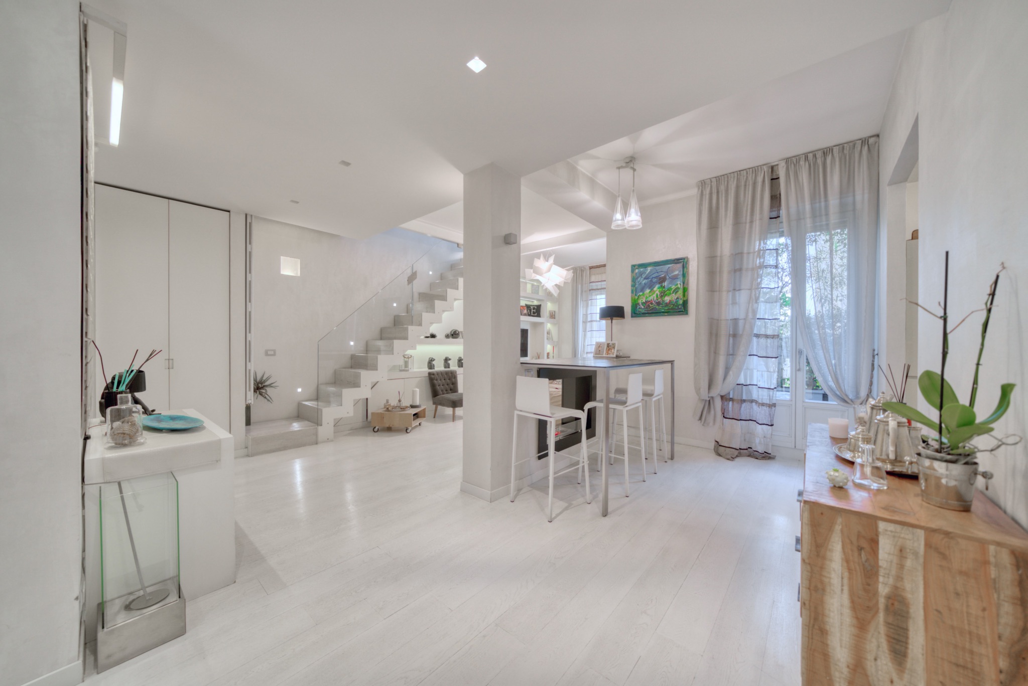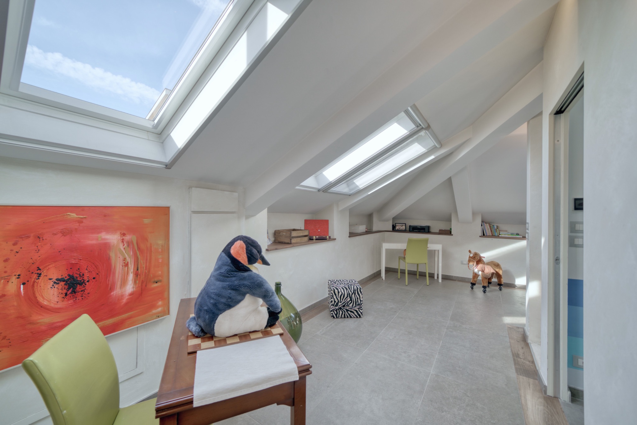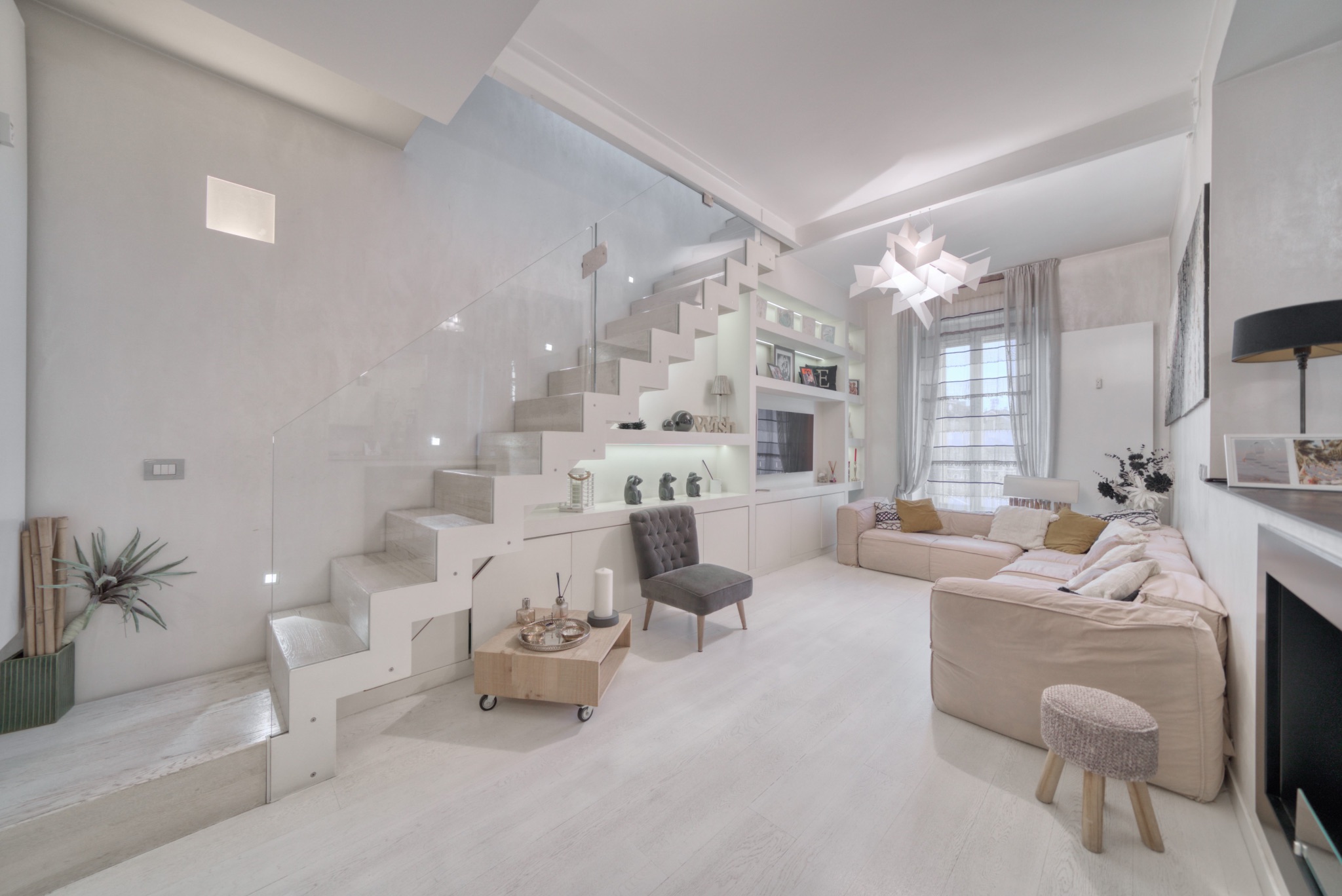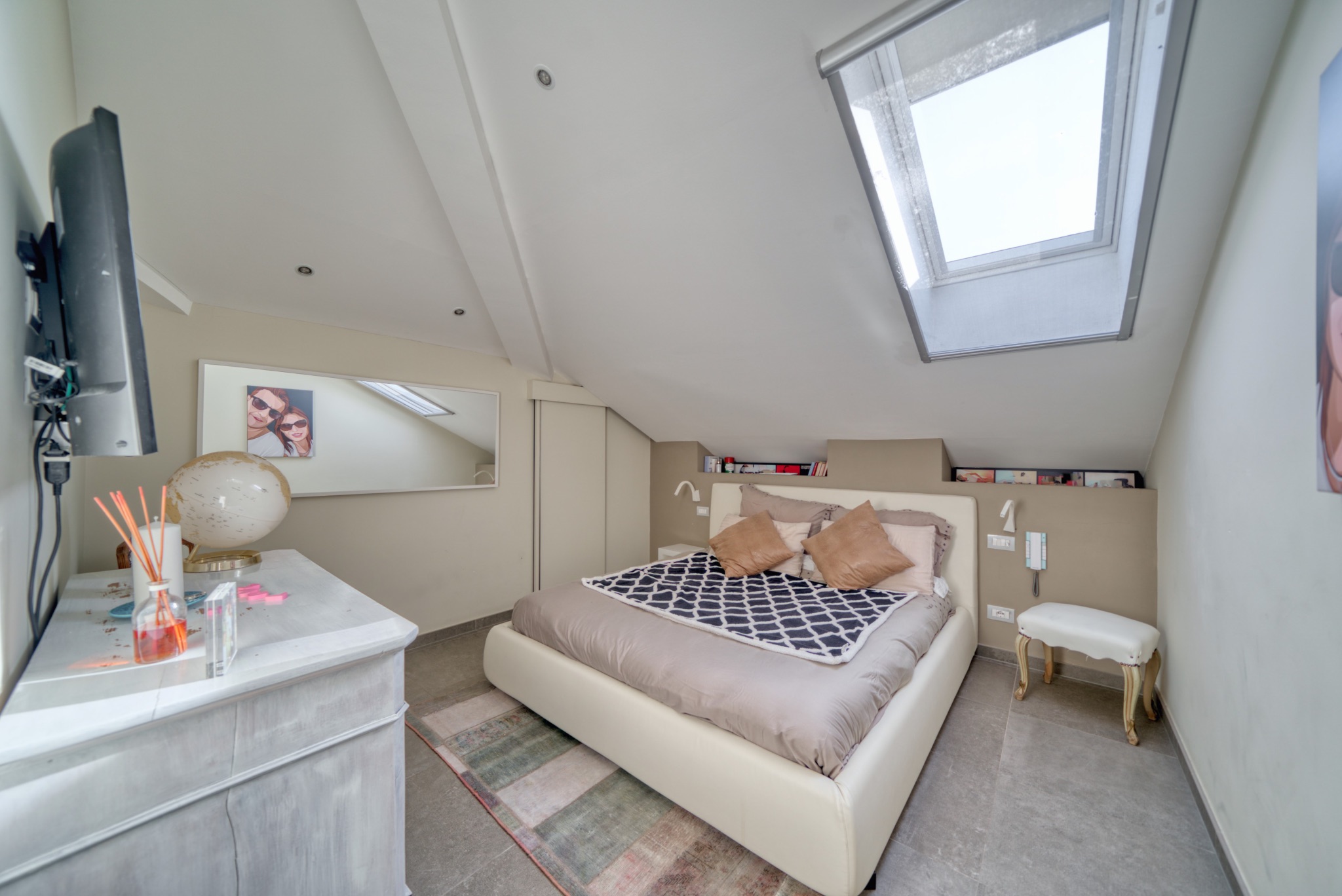 Le fotografie valorizzano la luce naturale, gli spazi e l’atmosfera dell’appartamento, esaltando le caratteristiche dell’ultimo piano e della mansarda.